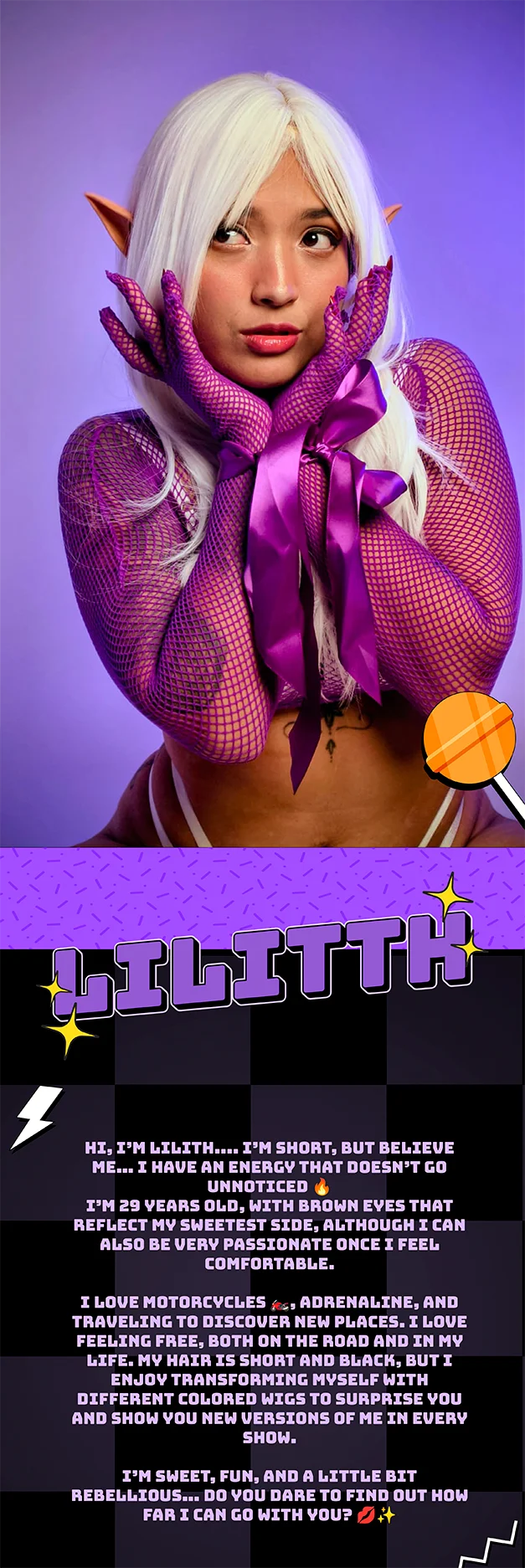 Nice to meet you, I'm Lilith and I'm passionate about motorcycles, I'm 1.60 cm tall.